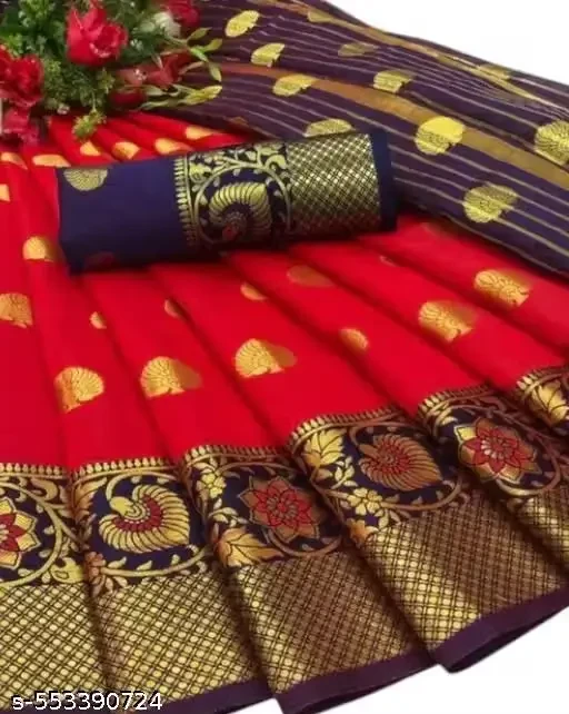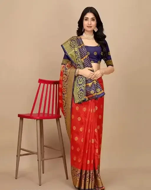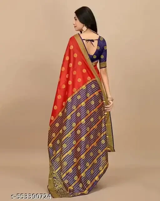 Exquisit women’s soft Banarasi Silk saree (Red color) with Golden Polka Dots and Blouse Piece (Red color).