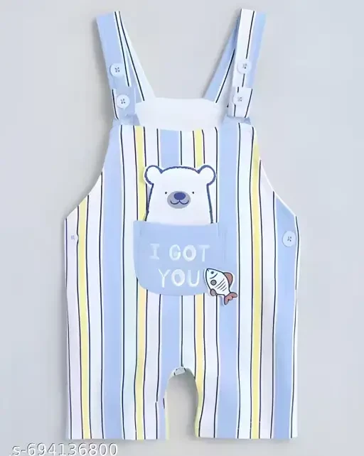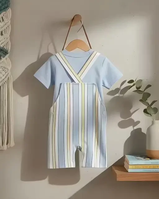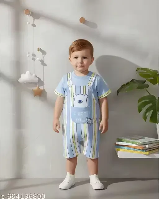 Give your princess the perfect mix of comfort and cuteness! This all-in-one dungaree-style romper is crafted from ultra-soft, breathable fabric, making it ideal for the delicate skin of babies aged 0 to 2 years. The charming blue and yellow striped pattern paired with a 2-piece look offers a high-end boutique feel at an affordable Meesho price.